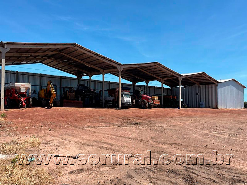 Fazenda equipada com tratores de esteira, escavadeiras hidráulicas, motoniveladora, diversos tratores agrícolas (até 370 cv), plantadeiras (até 27 linhas), pulverizadores, distribuidora de fertilizante, triturador de raizes, carretas agrícolas diversas, implementos diversos, caminhão pipa, caminhão munck, picape, várias motos, etc.
